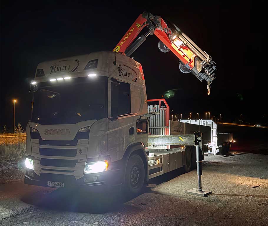 Etter litt forsiktig oppstart kan vi nå si at vi har en kranbil i full drift. Ta kontakt med vårt kjørekontor hvis du har behov